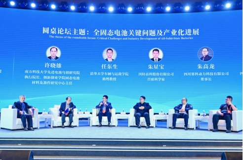 圆桌论坛环节,南方科技大学先进电池乌镇研究院执行院长、创新创业学院固态电池材料及器件研究中心主任许晓雄、清华大学车辆与运载学院助理教授任东生、国轩高科股份有限公司首席科学家朱星宝、四川赛科动力科技有限公司董事长朱高龙、四川华宜清创新材料科技有限公司董事长杨敏等嘉宾,围绕“全固态电池关键问题及产业化进展”这一主题进行对话。