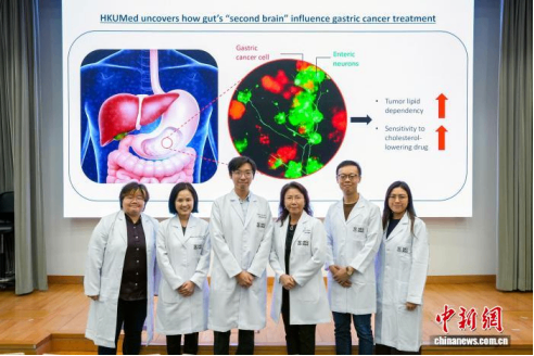 11月25日,香港大学公布,该校医学院研究团队在胃癌研究上取得突破,揭示人体消化系统中的肠神经元,会影响肿瘤生长及治疗反应。图为香港大学医学院生物医学学院副教授黄兆麟(左三)和研究团队合影。